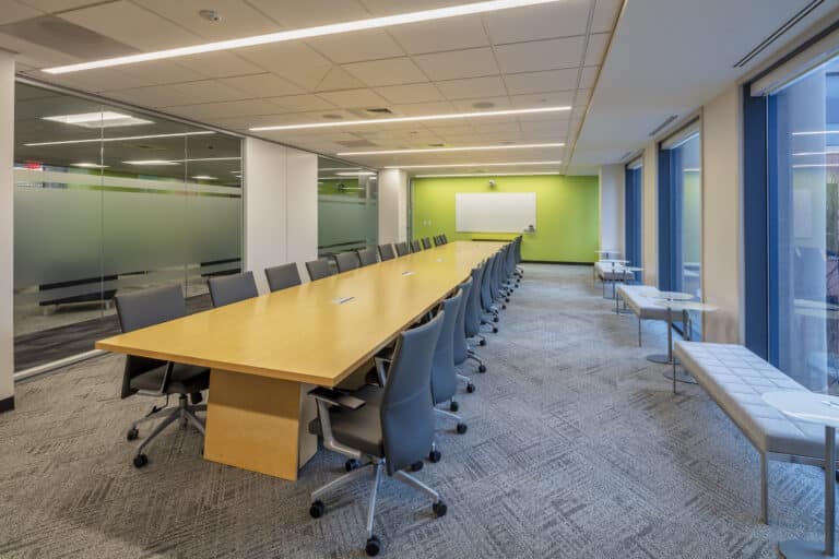The large area on the 4th floor houses 140 employees and allows M&T staff and departments to work together on a single floor plate. Its layout, architectural features, technology, and furniture foster operational efficiency, engagement and collaboration, and employee wellness. The space also offers copious amounts of natural daylight.